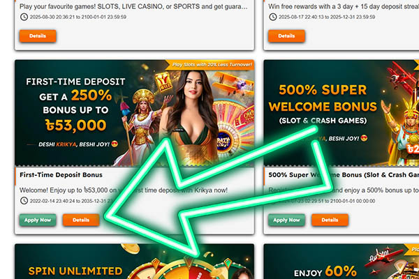 Welcome! Deposit for the first time and get a 100% Slot & Crash Bonus up to 18,000 taka, a 50% Casino Bonus up to 20,000 taka, and a 100% Sports Bonus up to 15,000 taka! Join now and enjoy awesome rewards at KRIKYA!